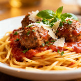 Al dente Spaghetti enveloped in a rich Marinara sauce, paired with handmade Meatballs, aged Parmesan, and a touch of fresh Herbs - an Italian classic perfected.